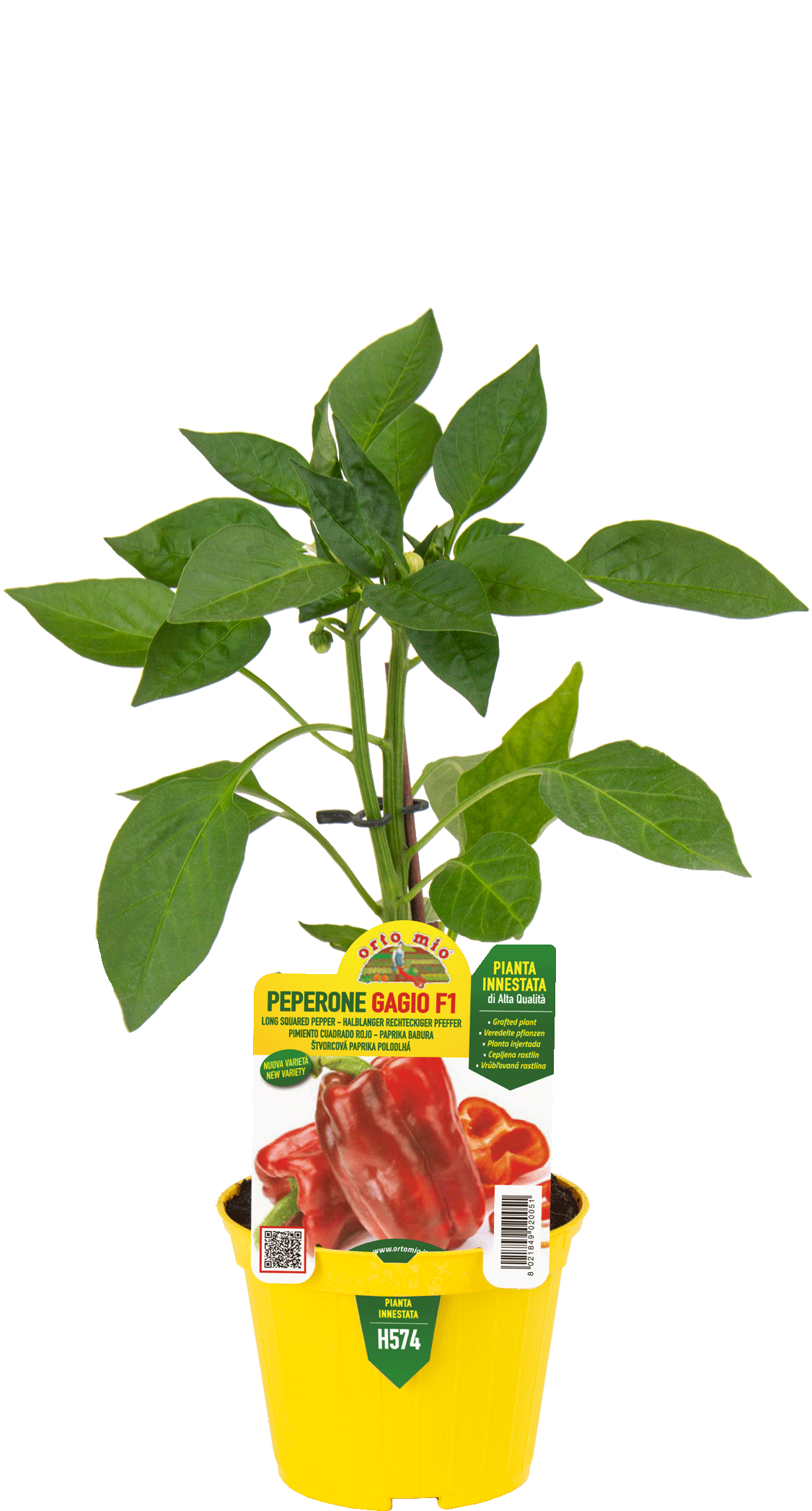 Varietà esclusiva con frutti squadrati allungati, di 300-400 gr. con polpa dolce e carnosa. Ha ciclo precoce e buona vigoria di pianta. È naturalmente resistente a virus. Si consiglia una generosa concimazione all’impianto, con sostanza organica a pronto effetto e fertilizzante minerale NPK. Per una produzione più prolungata si giova dell'apporto di un concime bio ogni 2-3 settimane. Per circa un mese dopo il trapianto, staccare i primi frutti prodotti alle dimensioni di una noce, senza lasciarli ingrossare, per consentire alla pianta di strutturarsi al meglio. Le bacche verdi assumono il colore rosso dopo 3-4 settimane da quando la pezzatura dei frutti non cresce più. La pianta di Gagio innestata, rispetto alla piantina tradizionale offre una maggiore precocità, più produzione e minori rischi di collassamento delle piante per patologie radicali in terreni infetti dalle comuni patologie del suolo.