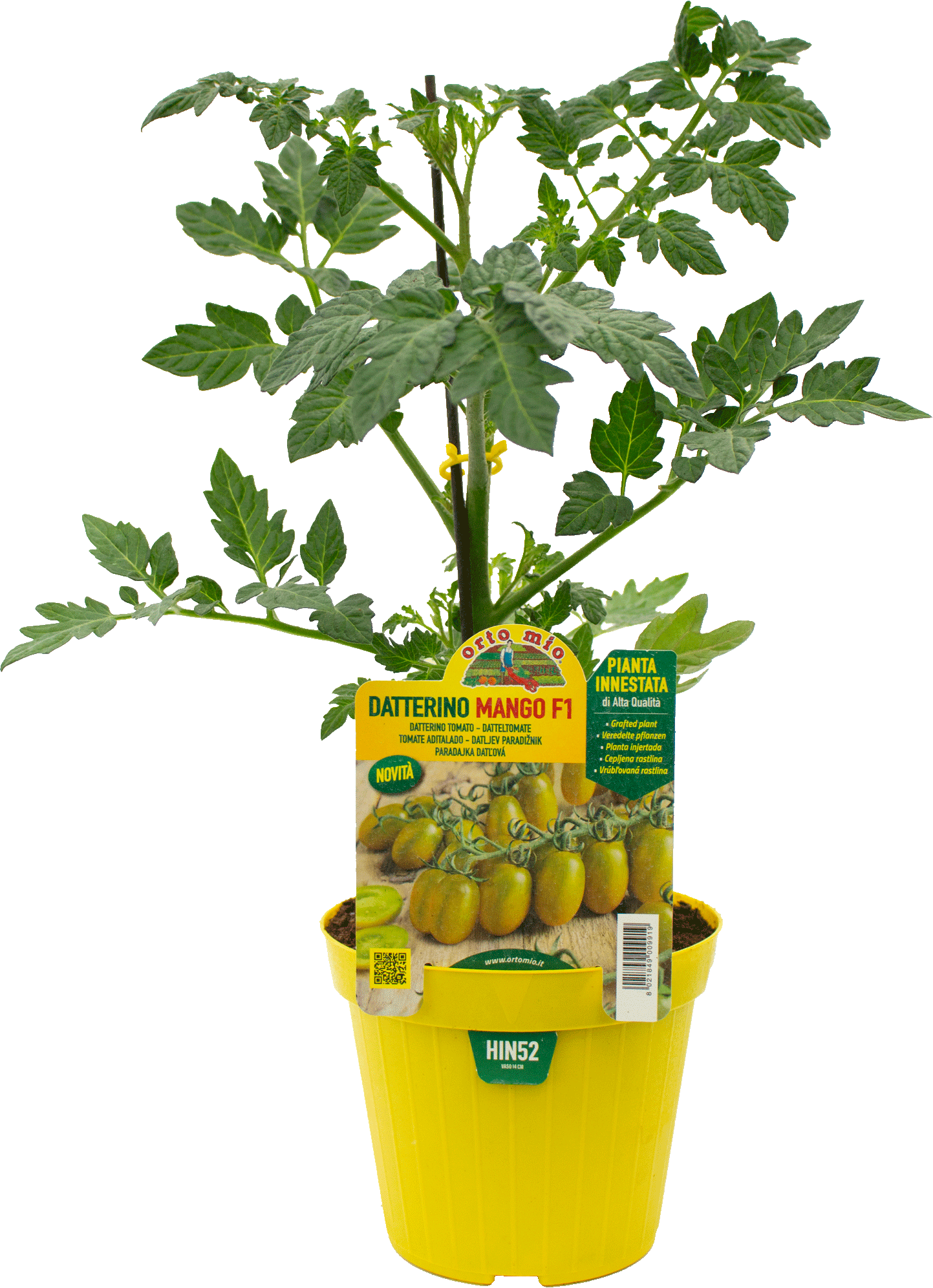 Nuovo datterino molto originale, dall'attraente color mango, con polpa verde e sapore buonissimo. Rispetto alle altre varietà verdi sul mercato è più gustoso e ha il grande vantaggio di evitare il rischio di raccogliere frutti acerbi. La buccia infatti cambia colore a maturazione assumendo la tipica tonalità che ricorda la polpa del Mango. Il gusto unico, dolce e fruttato, si esalta grazie all'equilibrio con l'acidità, e distingue mango dai classici datterini. Le bacche sono tra le più grandi tra i datterini (20-30 gr) e sono tolleranti al marciume apicale. La pianta, precoce, ha un ottimo vigore e produce a lungo. Si adatta sia alla coltivazione in serra che in campo aperto. Varietà naturalmente resistente a Cladosporiosi e grazie all'innesto anche a molte gravi patologie fungine radicali e a nematodi.