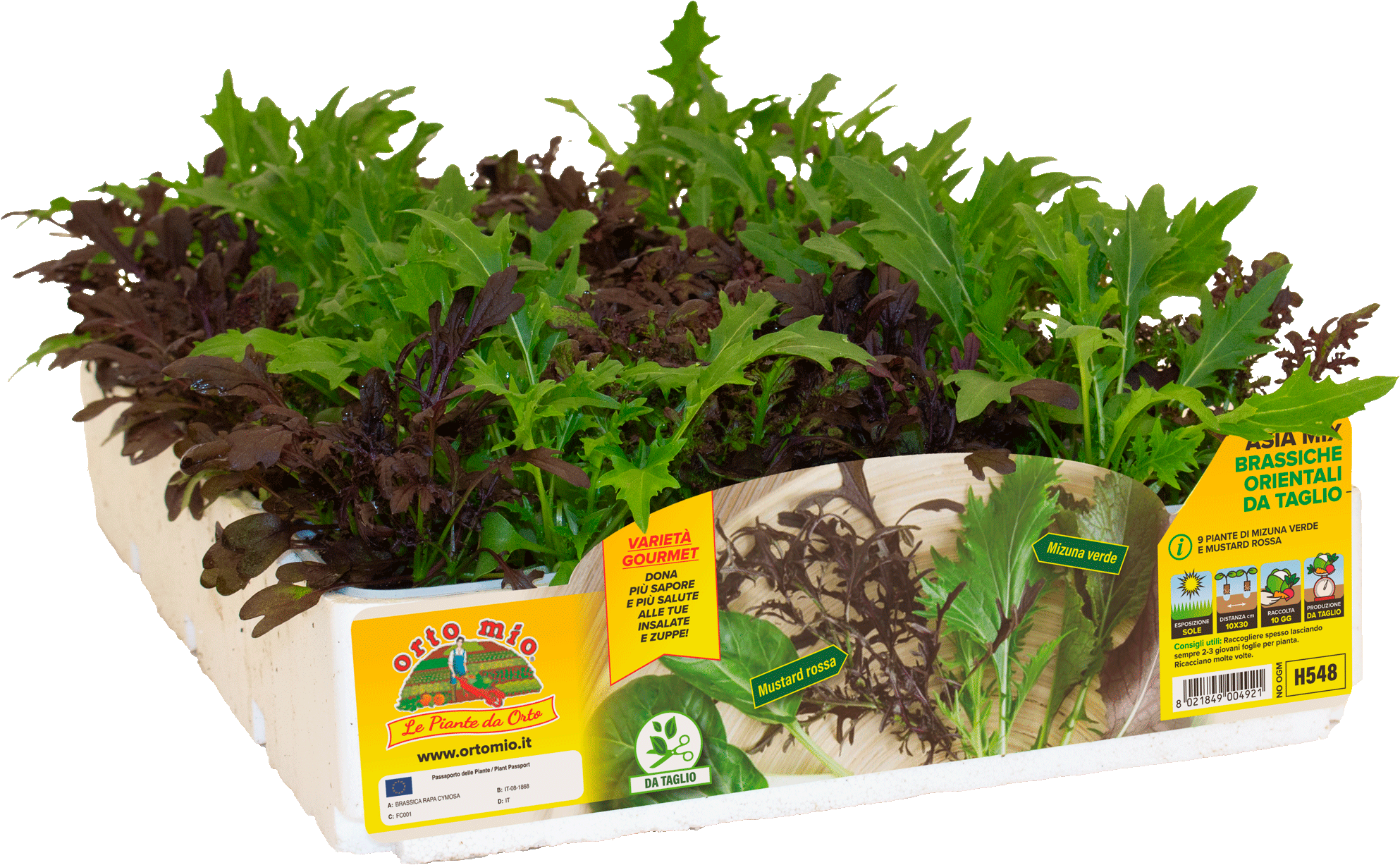 Miscuglio di brassiche orientali da taglio, composto da 3 ciuffi di Mizuna verde, 3 di Mizuna rossa e 3 di Red Mustard. Ultima tendenza per chi ama i super food. Dal sapore marcato, sono ottime crude in mix con lattughe, esaltandone il sapore e i benefici per l’organismo. Buone anche nelle zuppe. Si effettuano diversi tagli con le stesse piantine.