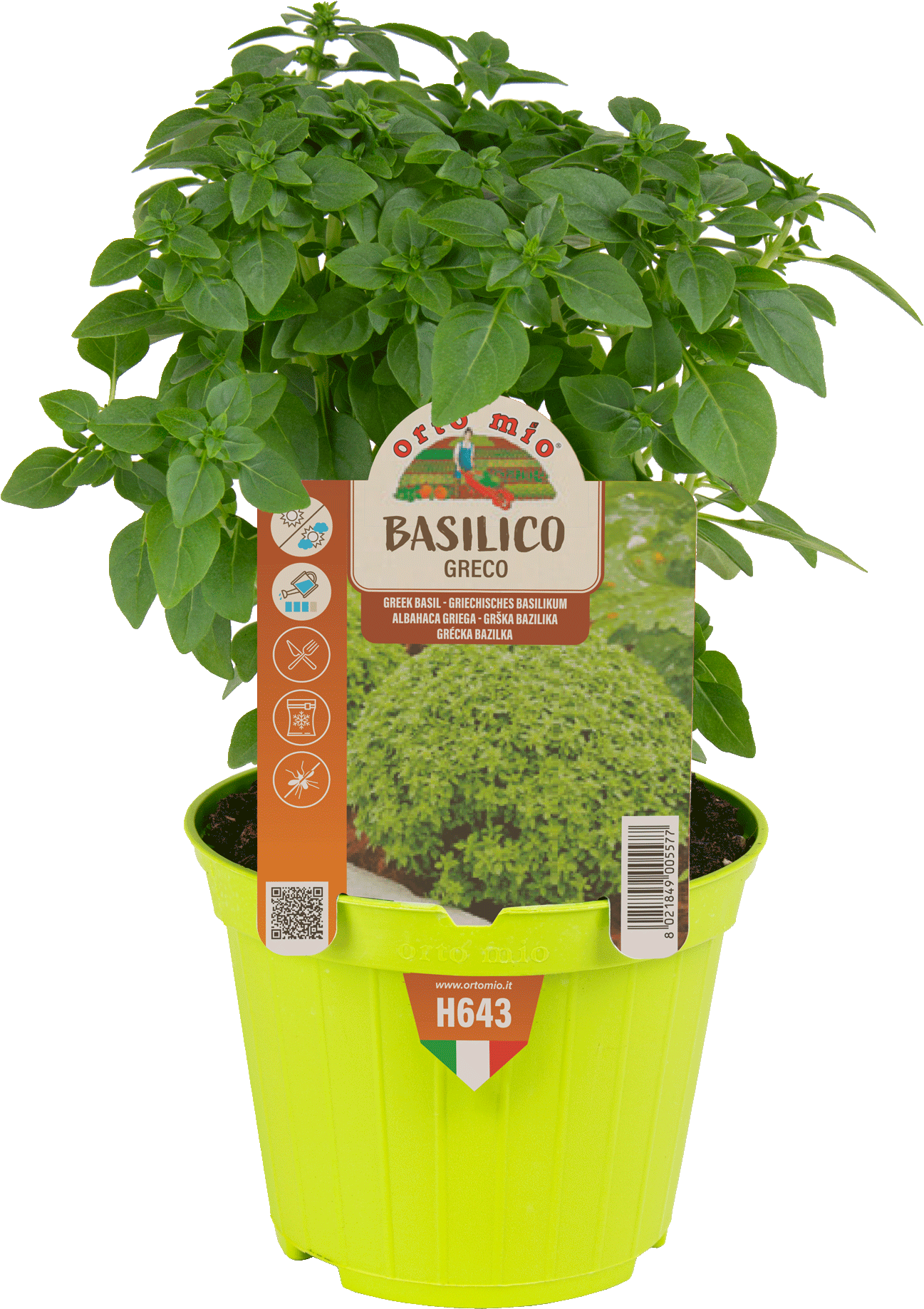 Il basilico greco ha un portamento molto compatto, dalla tipica forma “a palla”. Le foglie, di colore verde chiaro, sono piccolissime e hanno un aroma molto intenso. Ottimo nelle salse, con il pesce e il pollo, e nella pasta. Si può coltivare sia in vaso che in campo. Come gli altri basilici gradisce temperature oltre i 20° e deve essere cimato frequentemente. L’olio essenziale è utilizzato per i liquori. Concimare ogni 2-3 settimane con fertilizzante bio liquido o granulare, per un buon vigore delle piante.