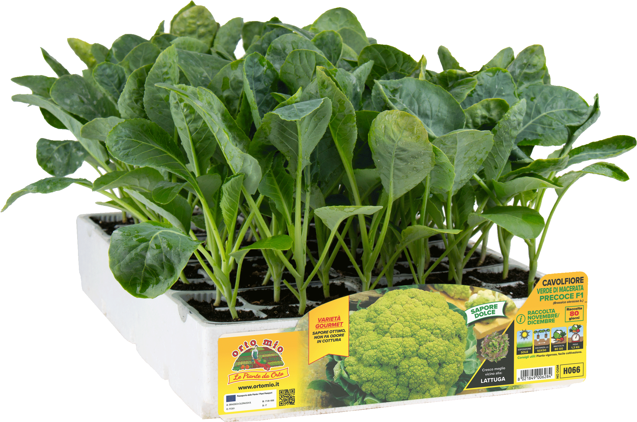 Cavolfiore verde di Macerata precoce, per raccolta autunnale. Ha pianta molto vigorosa e adattabile, di facile coltivazione. Pronto a 80-90 giorni dal trapianto, con buona contemporaneità di maturazione. Il portamento aperto della pianta facilita il controllo dell’avanzamento di crescita per la raccolta, da effettuare finchè il pomo è sano e compatto. Richiede più spazio rispetto ai cavolfiori tradizionali. Ha un sapore ottimo e fa meno odore in cottura rispetto ai cavolfiori tradizionali.