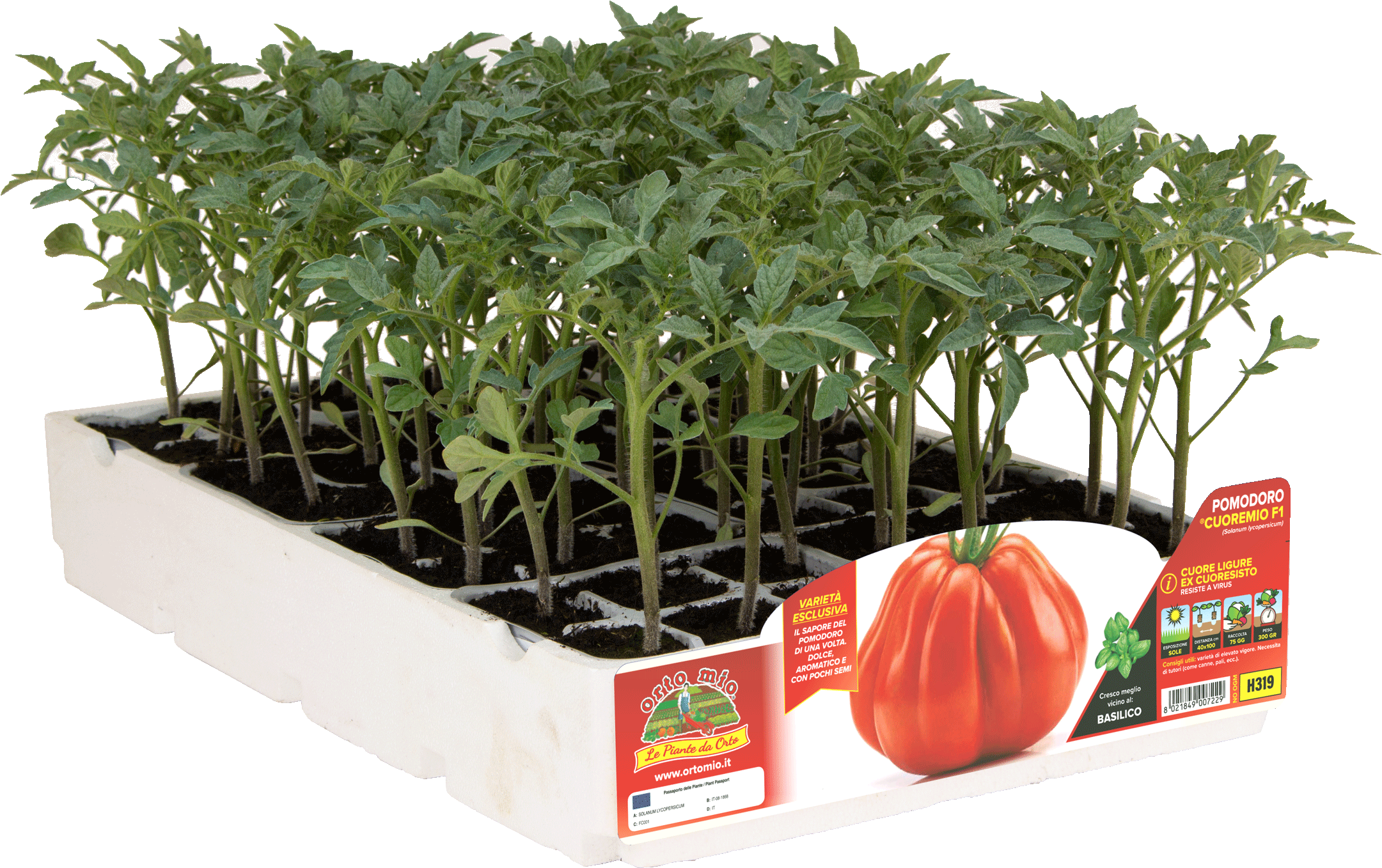 Cuoremio è il pomodoro cuore ligure del ponente esclusivo di Orto Mio. Ha bacche di circa 200 gr, con polpa gustosa come i pomodori di una volta, morbida e dalla tipica consistenza farinosa. Ha pochi semi e buccia sottile. La spalla del frutto a maturazione è verde. La pianta è vigorosa, adatta alla coltivazione sia in campo aperto che in serra. La produzione è generosa anche in piena estate, con discreta tolleranza al marciume apicale. Se si desiderano bacche di grandi dimensioni (oltre 250 gr), diradare i grappoli in accrescimento, lasciando 4-5 frutti per ogni palco. Cuore Mio è adatto sia per il consumo in insalata che per le salse. Naturalmente resistente a virus TSWV e alle comuni patologie radicali.
