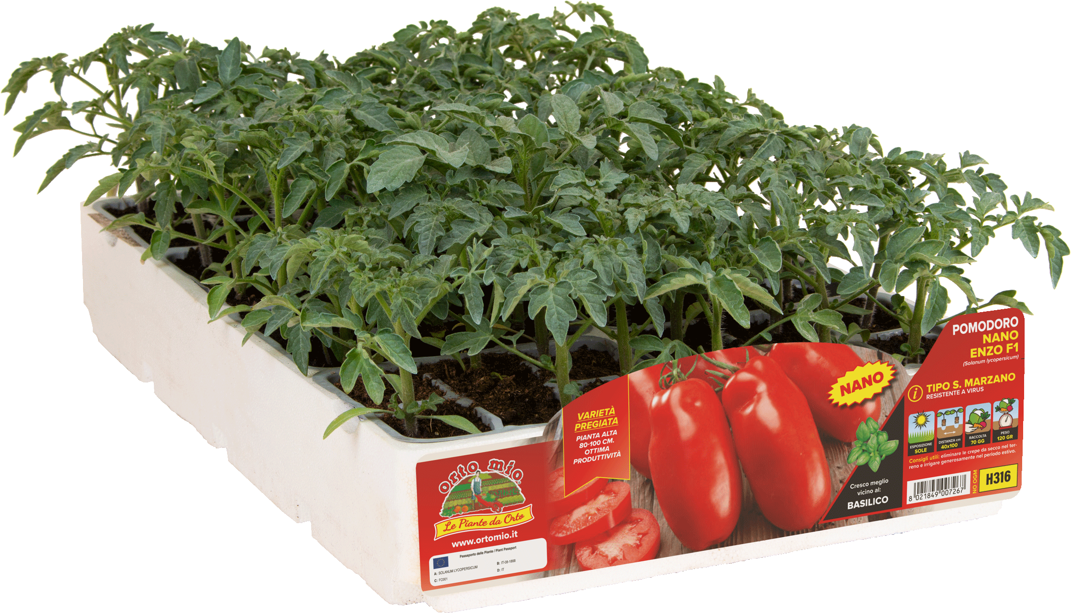 Pomodoro nano (80-100 cm) a frutti allungati, resistente a molte patologie. Le bacche, sode, di oltre 80 gr, hanno colorazione uniforme, priva di spalla gialla. La pianta è vigorosa e adattabile, con ciclo medio, per coltivazione in campo aperto. Per il consumo fresco in insalata e per salse. Ampia gamma di resistenze che comprende virus TSWV, batteriosi, nematodi e alle comuni patologie del suolo. Non togliere i getti ascellari. Volendo si può coltivare anche in verticale, legato ad un tutore, (eliminando le femminelle come per i pomodori da palo), per ottenere bacche di maggiori dimensioni.