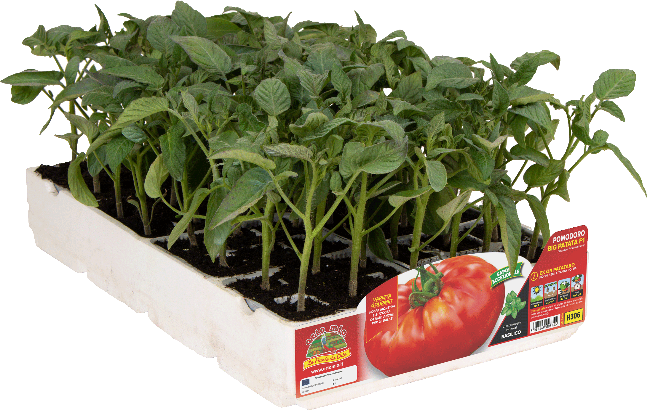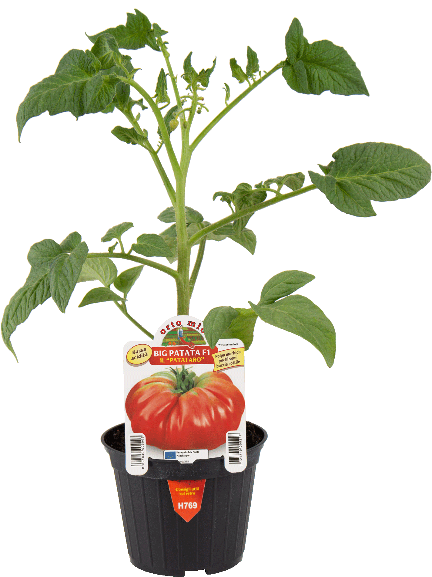 Pomodoro antico molto apprezzato, con caratteristiche foglie simili a quelle della patata. I frutti, tipo “bistecca”, sono morbidi e a buccia sottile, tra i più gustosi in insalata. Polpa con pochi semi e bassa acidità. Bacche di 4-500 gr (con l’innesto supera il kg). Raccogliere rapidamente a maturazione. La pianta, poco vigorosa, si giova di abbondante concimazione organica e minerale. Il trapianto tra aprile e maggio favorisce una produzione più generosa. I fiori di Big Patata tendono ad abortire facilmente nei periodi più caldi, quindi si consiglia di coltivarlo insieme a varietà tolleranti alla cascola fiorale per un raccolto senza interruzioni. Spesso si rivela utile lasciare una femminella "di scorta" a fianco all'apice della pianta per 3-4 settimane dopo il trapianto affinché possa sostituire la cima qualora si bloccasse lo sviluppo della cima principale.