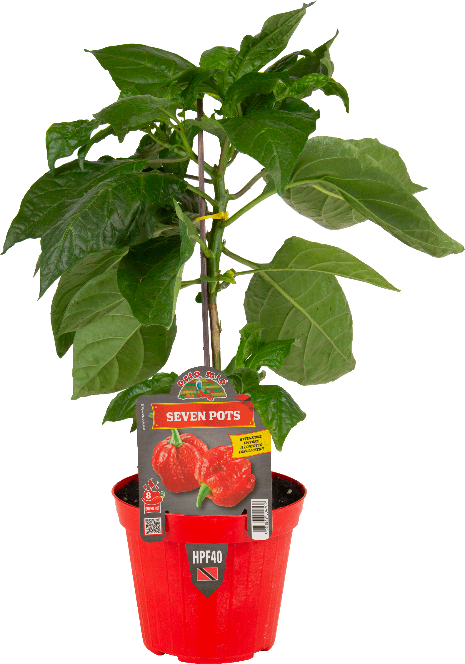 Caratteristiche: un mito per gli appassionati di peperoncini piccanti. Il nome 'Seven pots', sette pentole, significa che basta un solo peperoncino per insaporire 7 pentole di stufato. La pianta è molto vigorosa e richiede tutori.