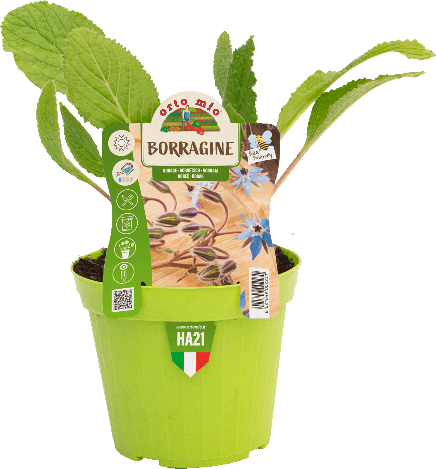Erbacea annuale di facile coltivazione, che raggiunge i 50-70 cm di altezza. La Borragine ama un terreno ricco, sciolto e privo di ristagni d’acqua, la sua crescita non presenta problemi particolari se in posizione soleggiata. Il momento migliore per la raccolta di foglie e fiori è il mese di giugno, quando le proprietà balsamiche sono all’apice, ma le foglie possono essere consumate in ogni periodo. Le foglie, se schiacciate, emettono un succo che ha l’aroma del cetriolo. Si può consumare direttamente da questo vasetto.